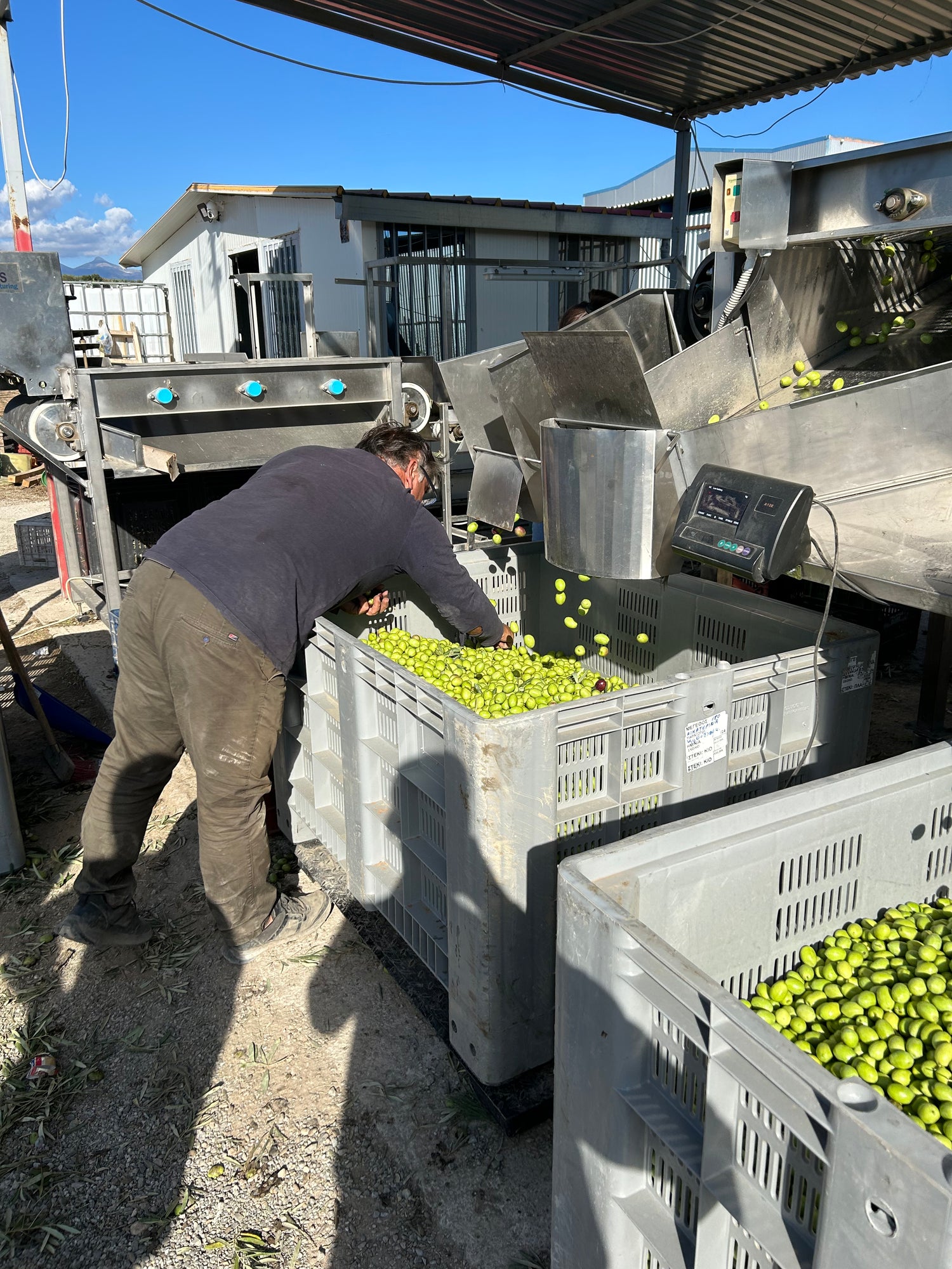 Die frisch geernteten Oliven werden per Hand und mit geschultem Blick von Giannis M. sortiert. Jede Olive wird nach Größe und Qualität bewertet, denn jede hat ihren eigenen Zweck: Die großen, saftreichen Früchte sind ideal für unser hochwertiges kaltgepresstes Olivenöl, während kleinere Sorten andere Verwendungen finden. Diese Arbeit ist entscheidend, denn Qualität fängt nicht erst in der Presse, sondern genau hier – bei der sorgfältigen Auswahl. Giannis ist einer der Menschen, die mit Präzision und Erfahrung dafür sorgen, dass am Ende nur das Beste in die Flasche kommt.