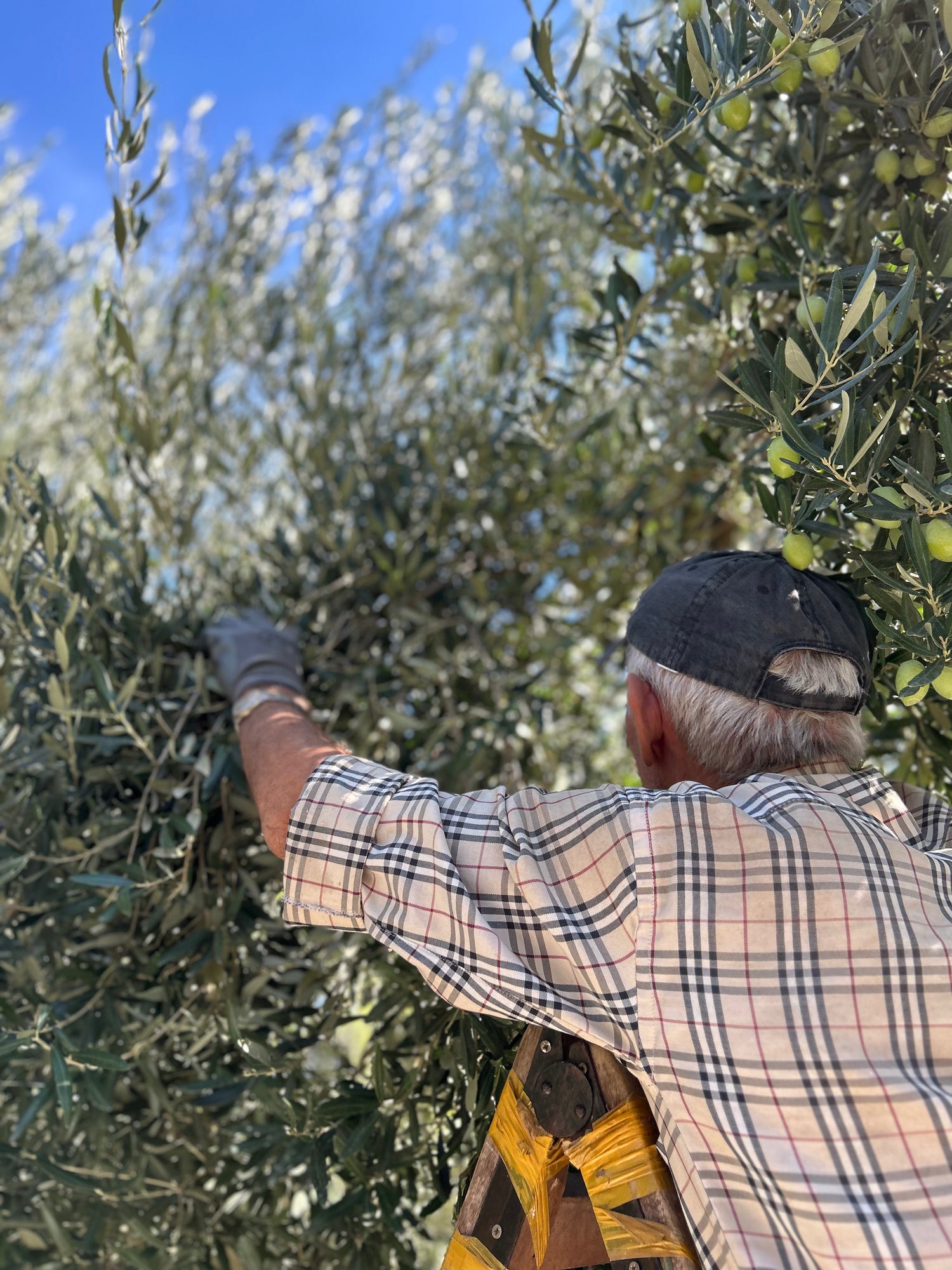 Unsere Oliven beginnen ihre Reise nicht auf einem Förderband, sondern in den Händen von Menschen, die ihre Arbeit lieben. Georgos S., einer unserer erfahrensten Mitarbeiter, pflückt jede Olive direkt vom Baum – schonend, mit Respekt vor der Pflanze. Keine Maschinen, keine Hektik – damit weder Frucht noch Ast unnötig belastet werden. Denn bei uns wird nicht geschüttelt, sondern gelesen. Diese sorgfältige Handarbeit schützt den Baum und sorgt für ein Produkt, das unverfälschter kaum sein könnte – unser bestes Olivenöl.